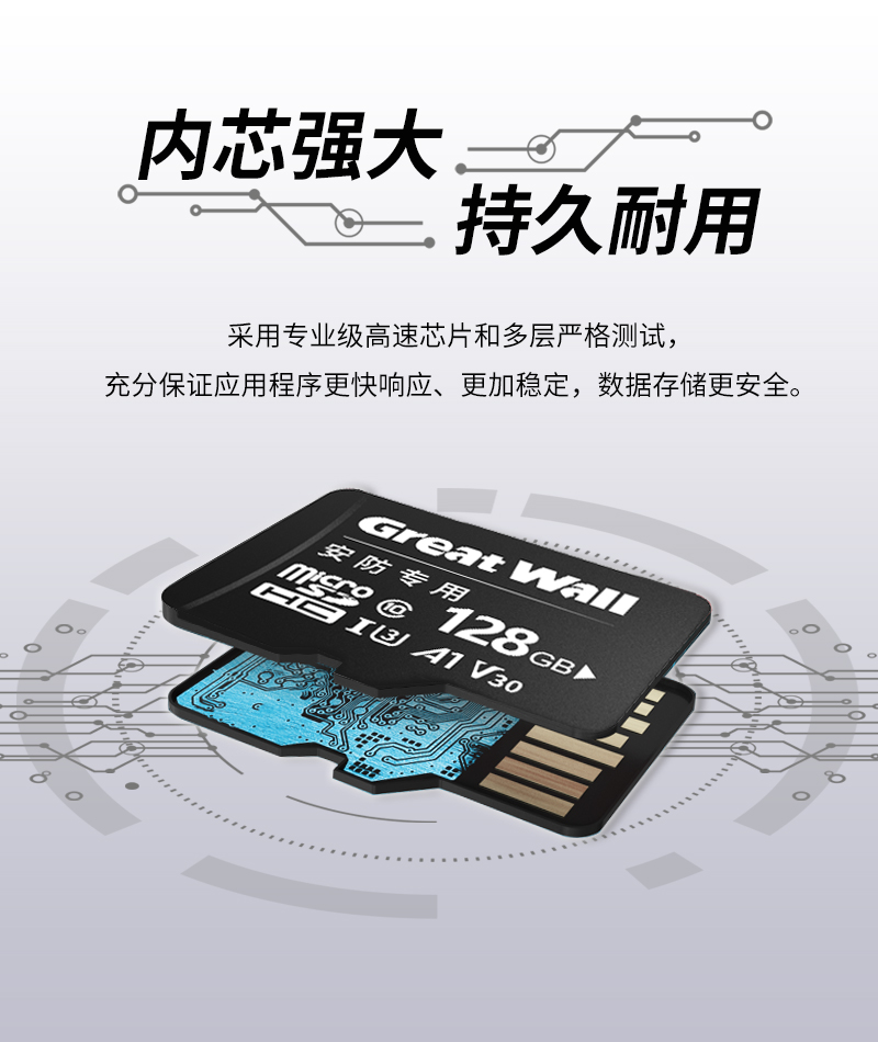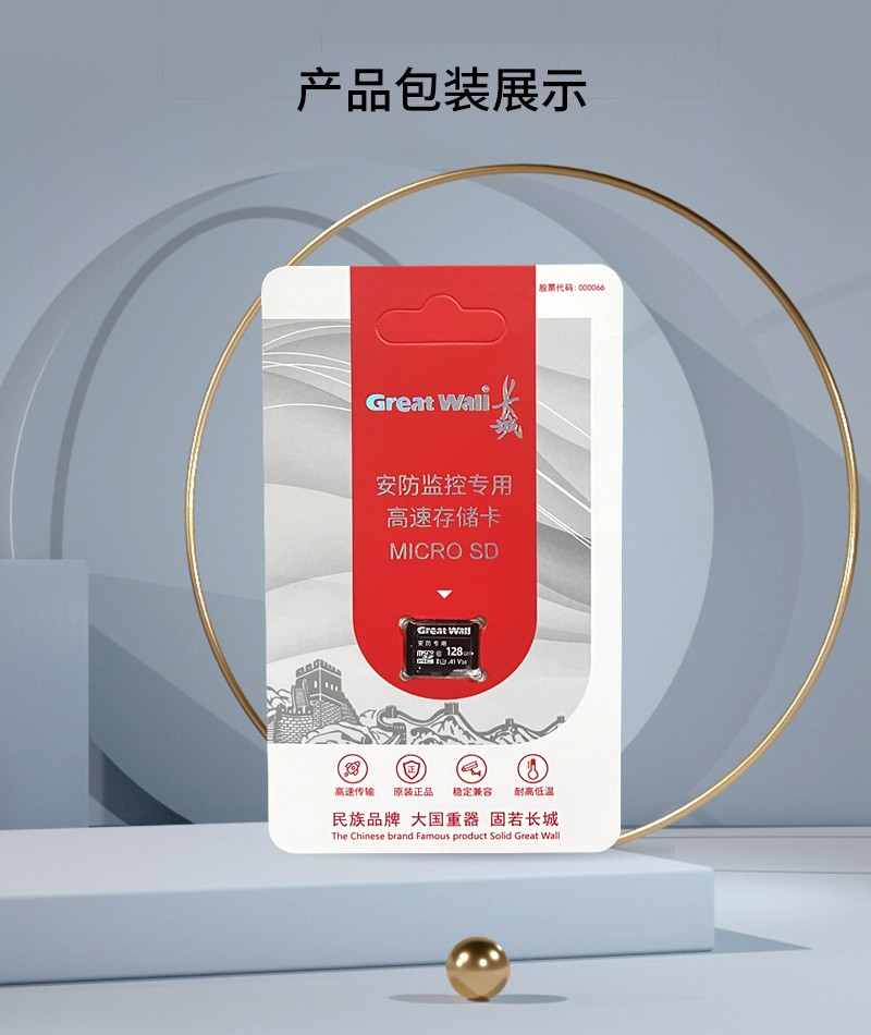 产品类别:长城GT50系列存储卡 产品名称:长城安防监控专用高速存储卡 兼容设备:监控设备、行车记录仪等 产品容量:32GB / 64GB / 128GB 性能速度:32GB 读速≥90MB/s,写速≥50MB/s; 64GB 读速≥95MB/s,写速≥50MB/s; 128GB 读速≥97MB/s,写速≥60MB/s; 产品尺寸:15X11X0.8mm 产品重量:0.5g 工作电压:约0.5V 工作温度:-25℃—85℃